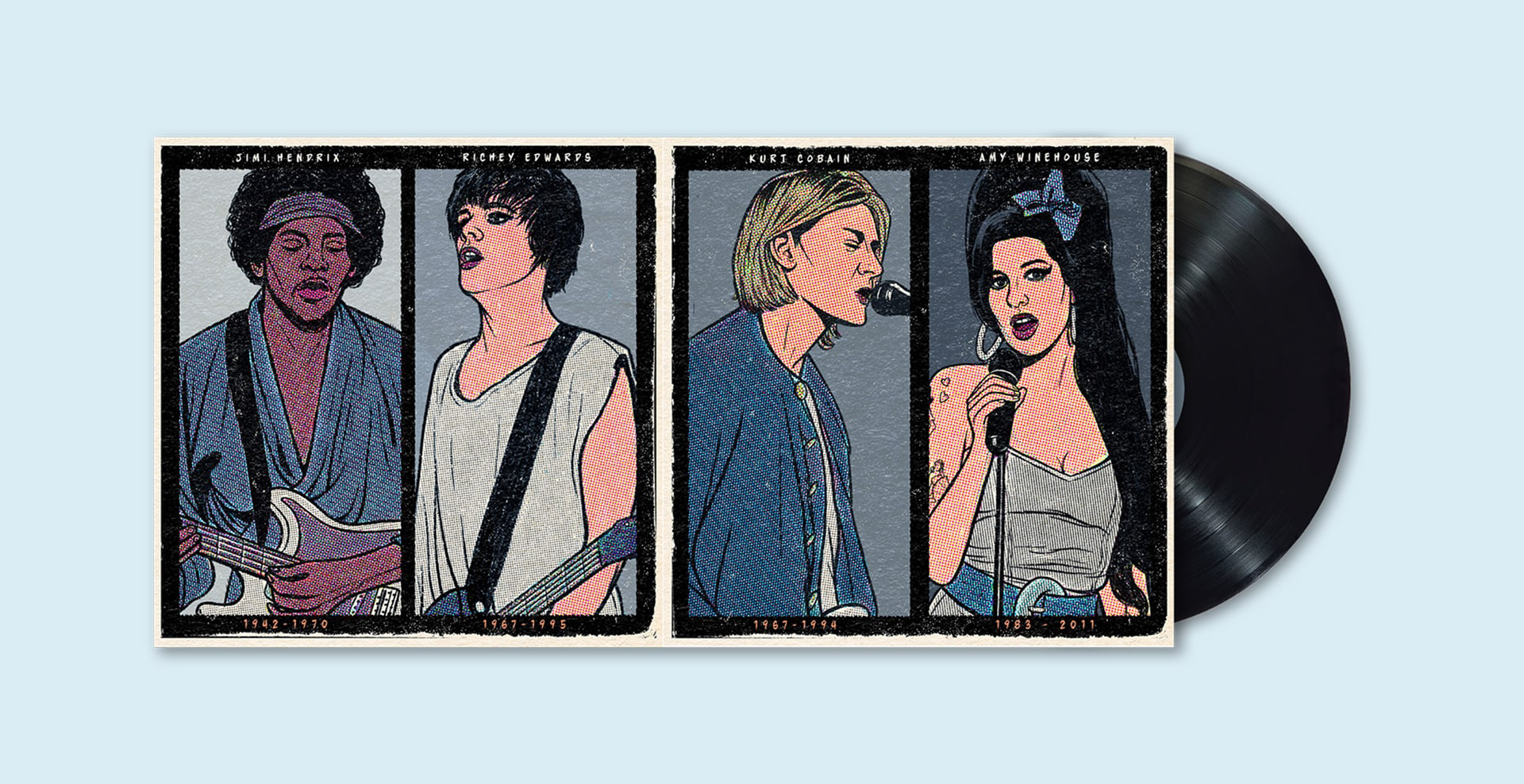 Symbolic imagery is at the heart of the project. The record focuses on four musicians who tragically passed away at 27: Amy Winehouse, Richey Edwards, Kurt Cobain, and Jimi Hendrix.